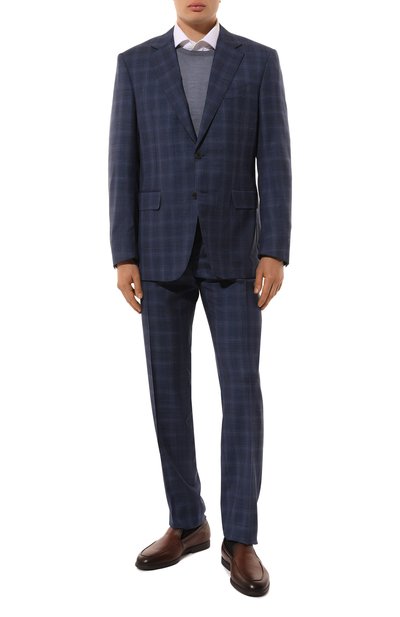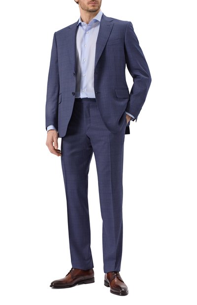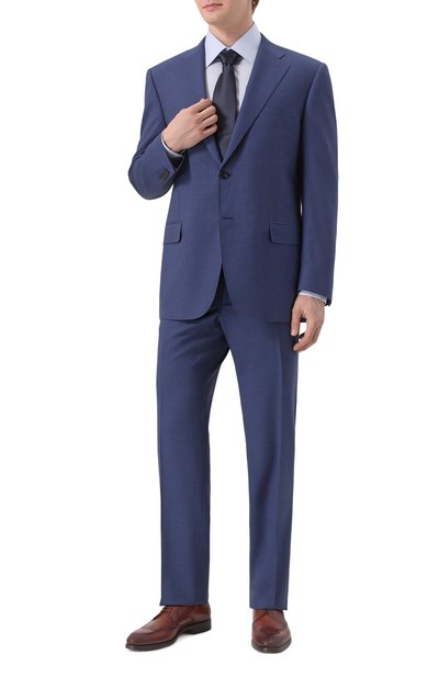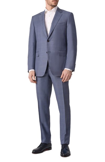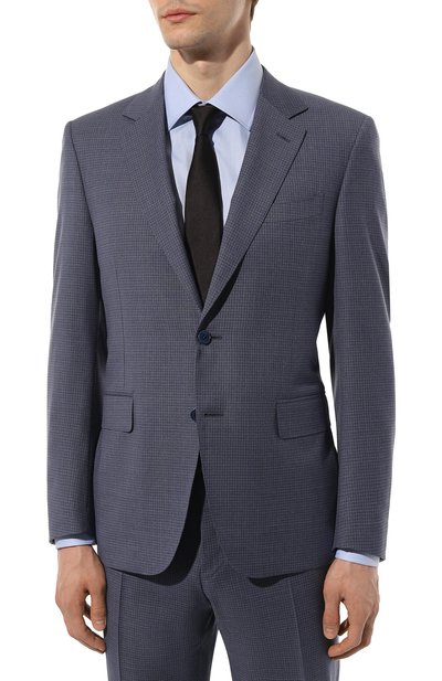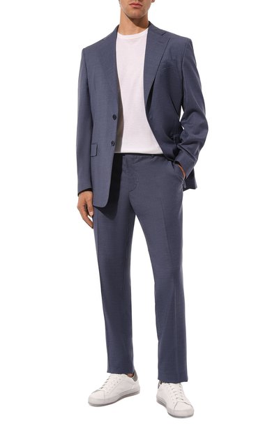 Костюм-двойку в едва заметную виндзорскую клетку выполнили из шерстяной ткани с добавлением кашемира. Однобортный пиджак с двумя шлицами дополнили нагрудным карманом и боковыми с клапанами, а брюки со стрелками – боковыми и задними с пуговицами.