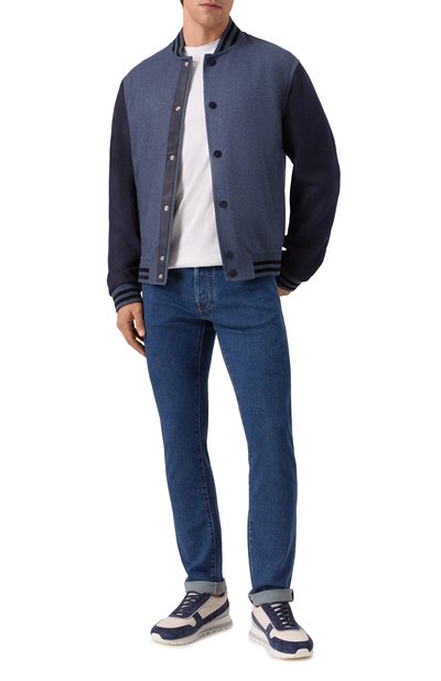 Бомбер с полосками на воротнике, манжетах и поясе в рубчик выполнили из шерстяного трикотажа. Плечи подчеркнули контрастными панелями, а на груди разместили брендированный патч. Сама куртка застегивается кнопками, а два врезных кармана – молниями.