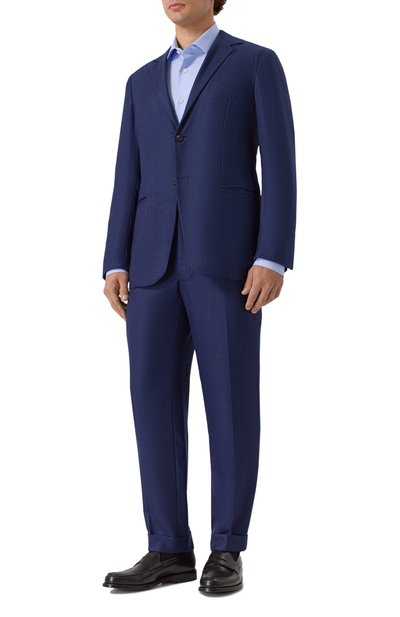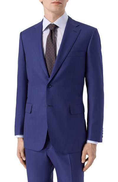 Для пошива костюма в меловую полоску использовали шерсть с добавлением кашемира. Пиджак с парой шлиц сзади дополнили нагрудным и двумя боковыми карманами, а у брюк предусмотрели четыре кармана. В комплекте — платок с вышивкой фирменного алого оттенка.