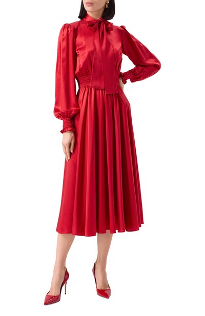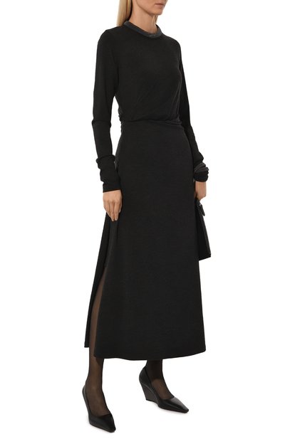 Миди-платье рубашечного кроя сшили из полупрозрачного шелка в мерцающую люрексовую полоску. Из этой же ткани выполнили широкий пояс-ленту. В комплект входит нижнее платье на тонких бретелях.
