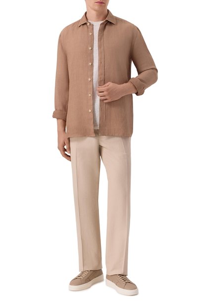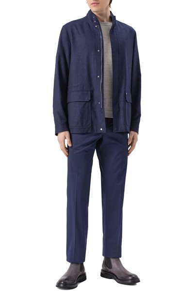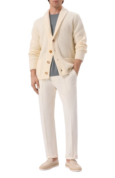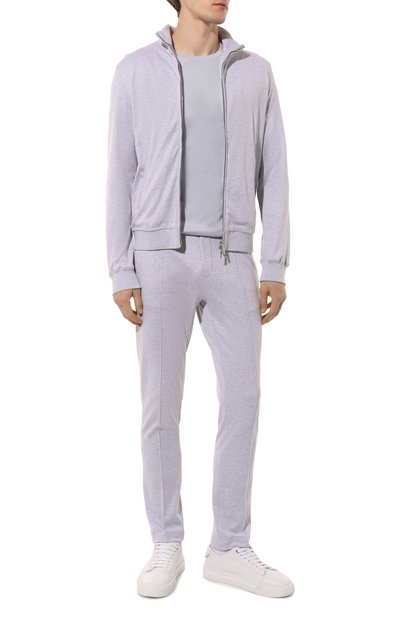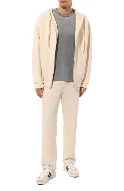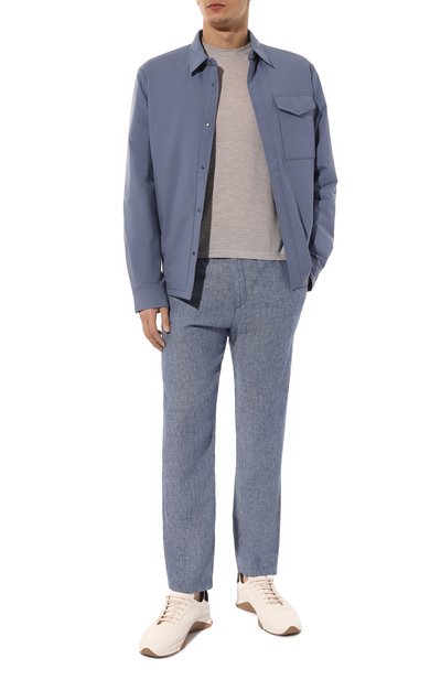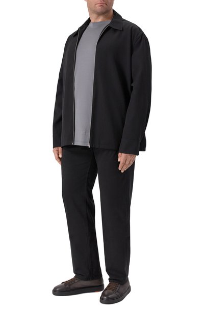 Для изготовления прямой футболки с горловиной в рубчик использовали шелк. Лаконичная модель гармонично дополнит комплект с вещами как в светлой, так и в темной гамме.