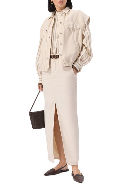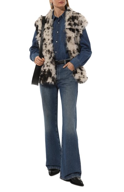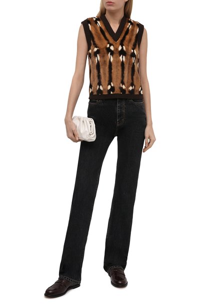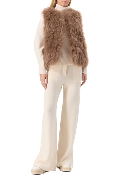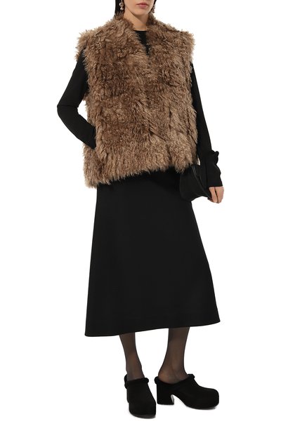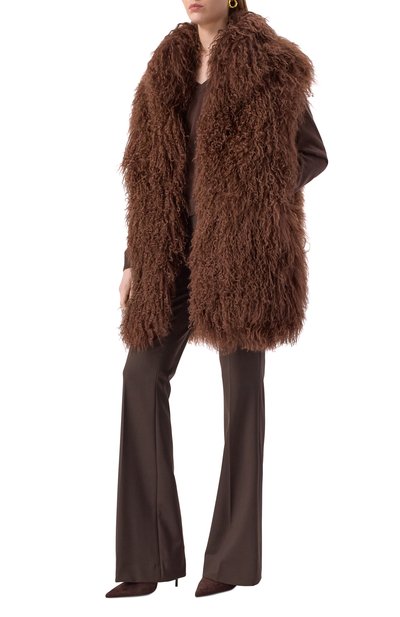 Лицевую часть двустороннего жилета сшили из густого меха козы, а изнаночную – из стеганого нейлона. Модель с наполнителем из утиного пуха и врезными карманами застегивается крючками.