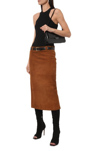 Ботфорты с зауженным мысом и высоким облегающим голенищем сшили из эластичной наппы. Сапоги без декора дополнили фигурным невысоким каблуком.