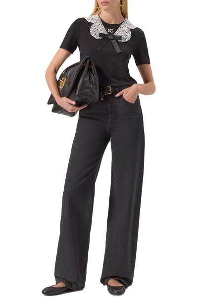 Футболку с эластичными манжетами выполнили из хлопкового джерси. Под круглой горловиной закрепили атласный бант, которому вторит контрастная вышитая монограмма DG.