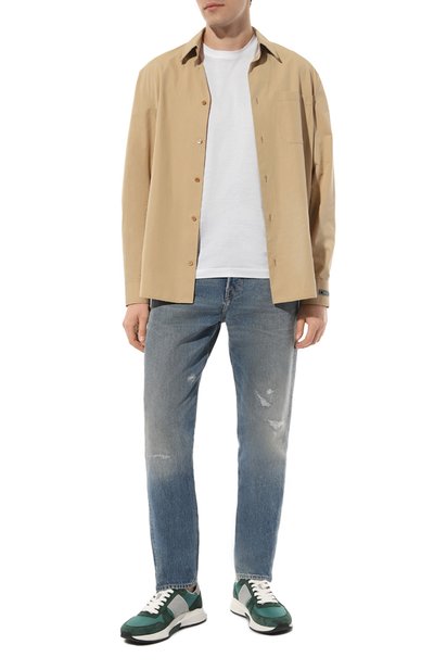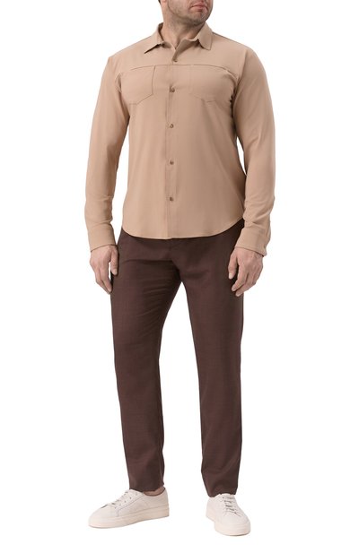 Для пошива рубашки на брендированных кнопках выбрали хлопковый вельвет стрейч с добавлением кашемира. На спинке предусмотрели бантовую складку, а левый нагрудный карман подчеркнули фирменным патчем.