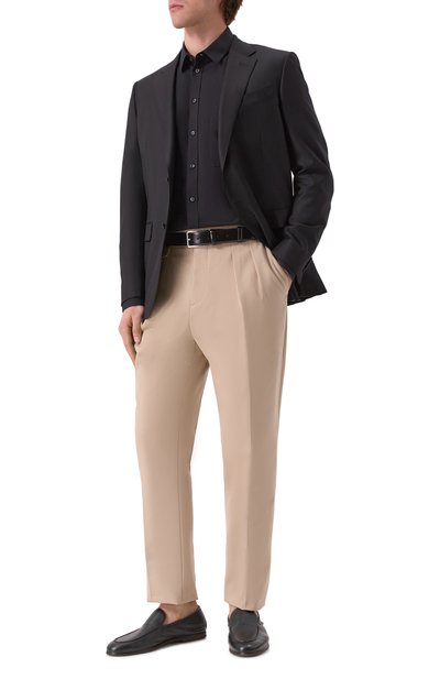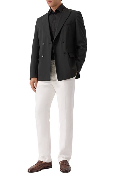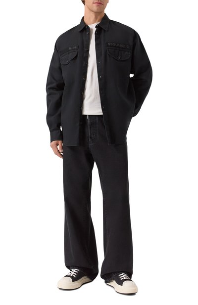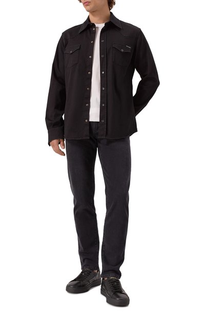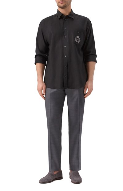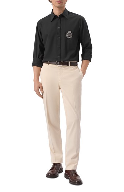 Для пошива рубашки на брендированных кнопках выбрали хлопковый вельвет стрейч с добавлением кашемира. На спинке предусмотрели бантовую складку, а левый нагрудный карман подчеркнули фирменным патчем.
