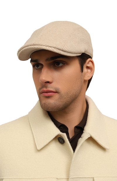 Для создания кепки с небольшим козырьком выбрали ворсованную шерсть с шевронным мотивом. Внутри края аксессуара отделали ребристой лентой грогрен.