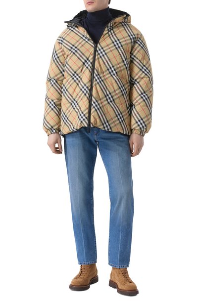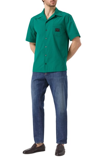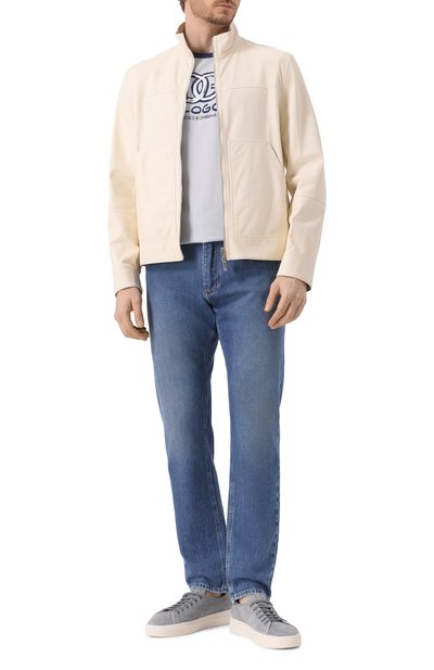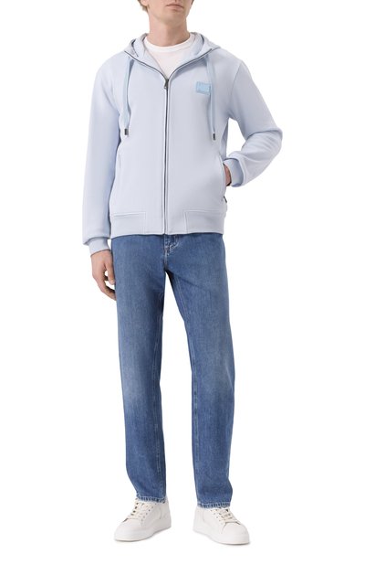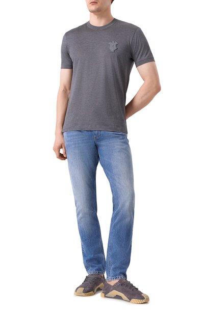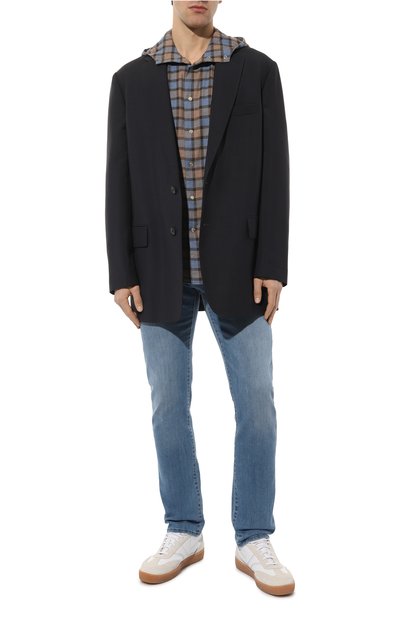 Прямые джинсы со смещенными боковыми швами выполнили из хлопкового денима. Принадлежность изделия марке подчеркнули фирменной двухслойной пластиной на одном из пяти карманов.