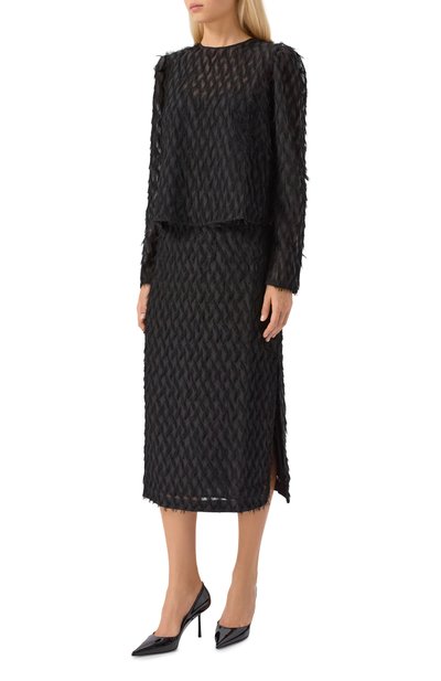 Облегающее поло из микса полиамида и вискозы составит образ total black с парной миди-юбкой. Эластичные манжеты и воротник подчеркнули контрастной двойной полоской, а спинку декорировали брендированным патчем.