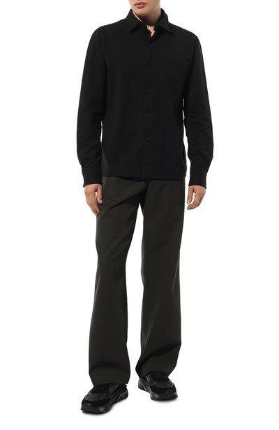 Кроссовки Nous на протекторной подошве с фирменными печатями выполнили из зернистой телячьей кожи и замши. Модель декорировали брендированным патчем на текстильном язычке, логотипом на заднике и эмблемами-иероглифами по бокам.