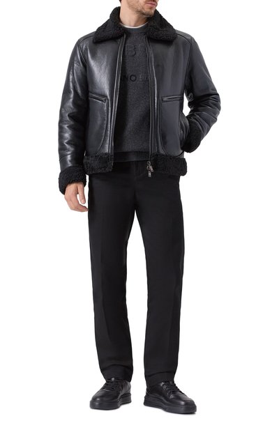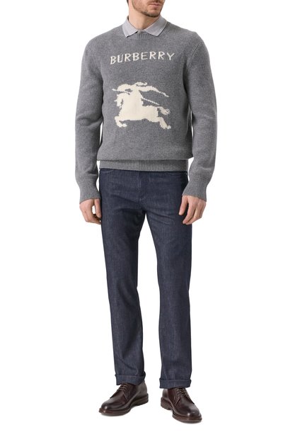 Свитер с контрастными рукавами, манжетами, горловиной и поясом связали из шерстяной пряжи с добавлением нейлона. Модель с небольшим фирменным ярлы ком сбоку и ярким вышитым мотивом спереди вошла в коллекцию Apres-Ski.