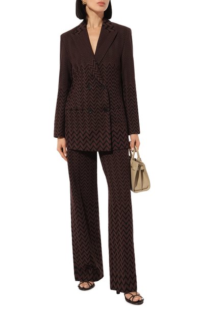 Однобортный жакет в крупный контрастный горох выполнили из тонкой шерстяной ткани. Модель с одной шлицей дополнили нагрудным карманом и боковыми с клапанами.