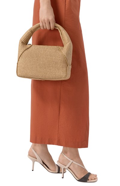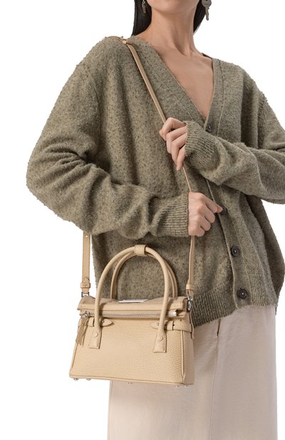 Сумку Tie Me с ручкой средней длины и съемным регулируемым ремнем выполнили из овчины и телячьей замши растительного дубления. Аксессуар с внешним и двумя внутренними карманами украсили декоративными съемными ремешком и брелоком.