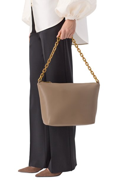 Сумка Tie Me с регулируемой ручкой застегивается молнией с пуллером. Аксессуар с тисненым логотипом выполнили из мелкозернистой наппы. Внутри — слот для карт.