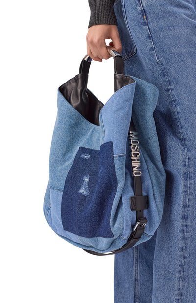 Сумку Tie Me с брендированным патчем сзади выполнили в технике пэчворк из денима нескольких от тенков, а для отделки использовали кожу. Модель с внутренними карточным слотом и карманом на молнии закрывается клапаном с двумя магнитными кнопками. В комплекте — съемные декоративный ремешок и регулируемый плечевой ремень.