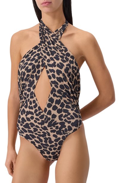 Слитный купальник с леопардовым принтом выполнили из стрейчевой нейлоновой микрофибры. Модель с открытой спиной и высокими вырезами для ног украсили логотипом спереди.