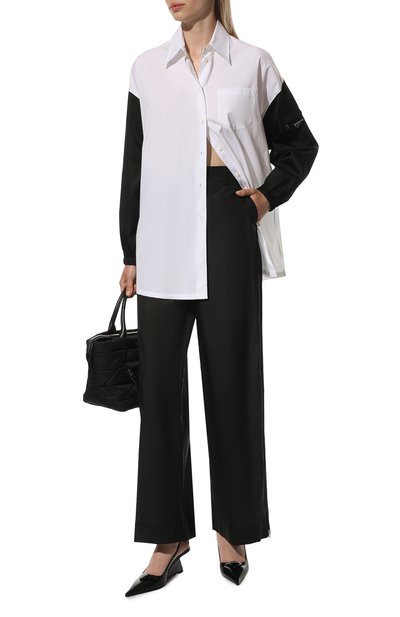 Блузку с фигурными боковыми разрезами выполнили из тонкой вискозы с добавлением шелка. Модель с отложным воротником застегивается обтяжными пуговицами.