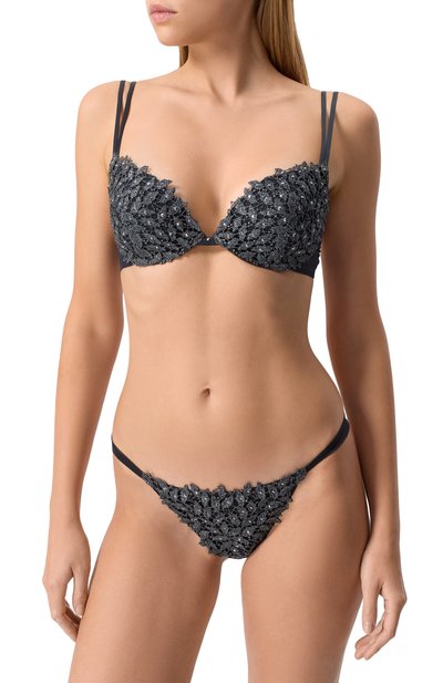 Стринги Amela из полупрозрачной вуали украсили вышивкой, подчеркнутой люрексом. Детали модели соединили между собой металлической фурнит урой, покрытой 24-каратным золотом.