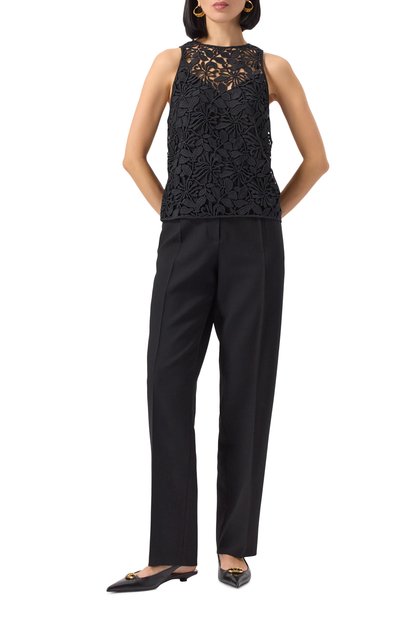 Топ с тремя обтяжными пуговицами выполнили из шелка. Спереди модель с закругленным низом украсили крупными ромбовыми вставками из кружева в тон.