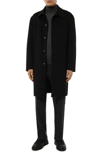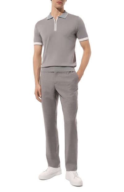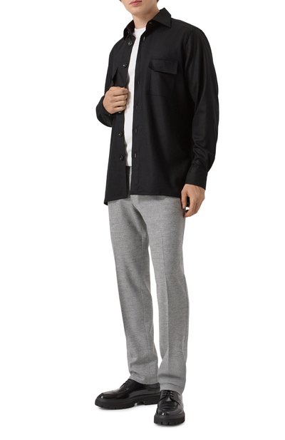 Для пошива брюк с задним и двумя боковыми карманами использовали шерстяной трикотаж. Модель дополнили ребристым эластичным поясом-кулиской.
