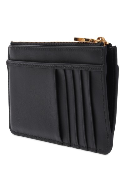 Футляр, украшенный тисненым логотипом спереди, выполнили из зернистой кожи. Аксессуар, застегивающийся кнопкой, дополнили тонким ремешком.