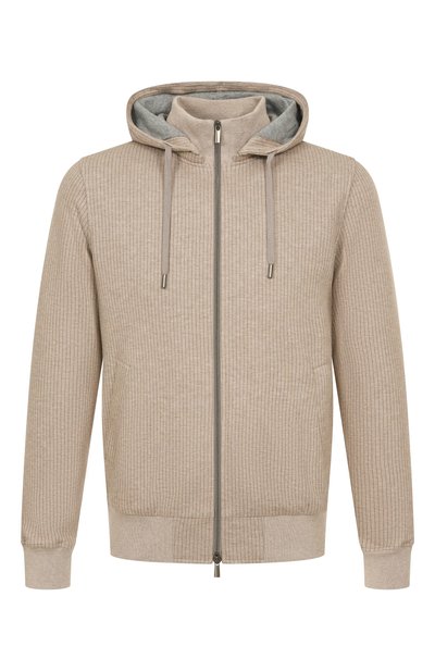 Толстовку со съемным регулируемым капюшоном выполнили из полосатого хлопкового трикотажа с добавлением нейлона. Модель с воротником-стойкой и двумя боковыми карманами застегивается встречной молнией.
