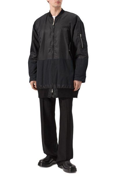 Бомбер с манжетами и поясом из трикотажа в рубчик и регулируемым капюшоном выполнили из шерстяной ткани с добавлением нейлона. Куртка с двумя накладными карманами застегивается встречной молнией.