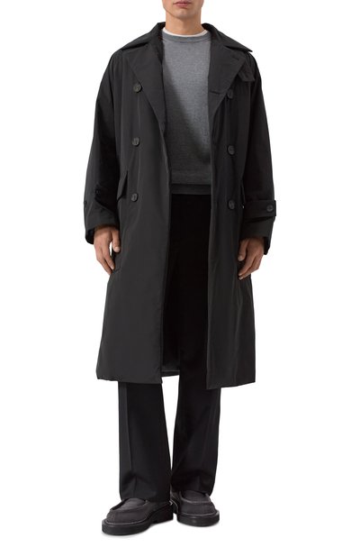 Для пошива однобортного пальто Cassano прямого кроя использовали влагостойкий микс хлопка и полиэстера. Модель со шлицей и широкими лацканами дополнили двумя врезными карманами.