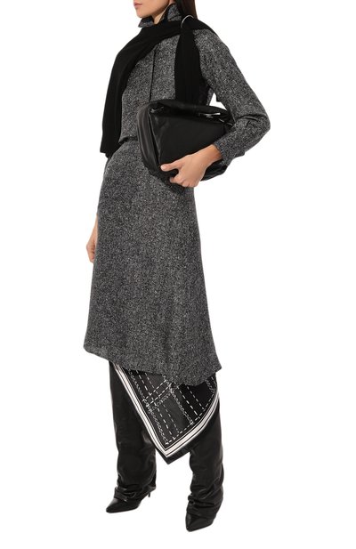 Расклешенную миди-юбку с шевронным мотивом выполнили из шерсти с добавлением нейлона и эластана. Модель с защипами дополнили двумя боковыми и парой задних карманов.