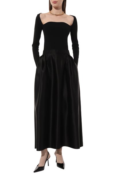 Для пошива лаконичной юбки с потайной боковой молнией использовали шелковый атлас. Предлагаем сочетать модель с парной блузой.