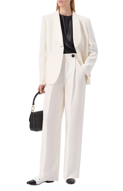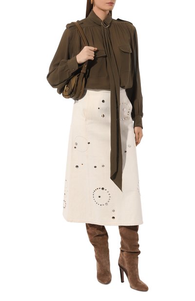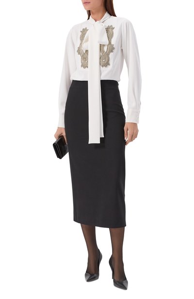 Блузку с гипертрофированным воротником аскот и высокими манжетами на пуговицах выполнили из матового полиэстера. Спереди модель украсили крупной кристальной композицией.