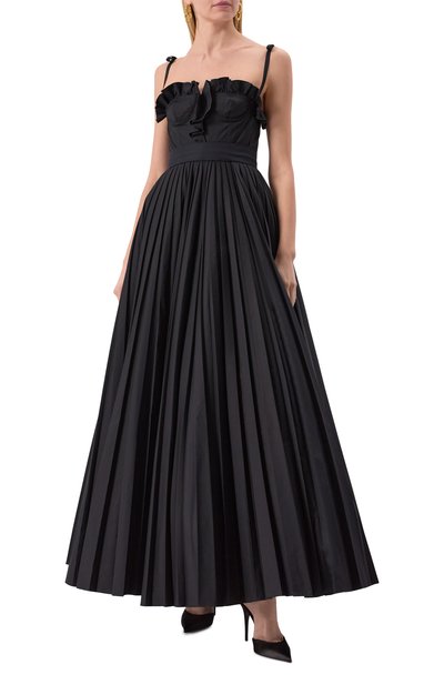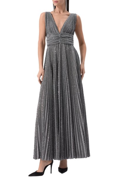 Длинное платье с потайной молнией сзади выполнили из шелка, заложив его в небольшие складки. Лиф спереди и широкие бретели изделия украсили вышивкой с бусинами и кристаллами.