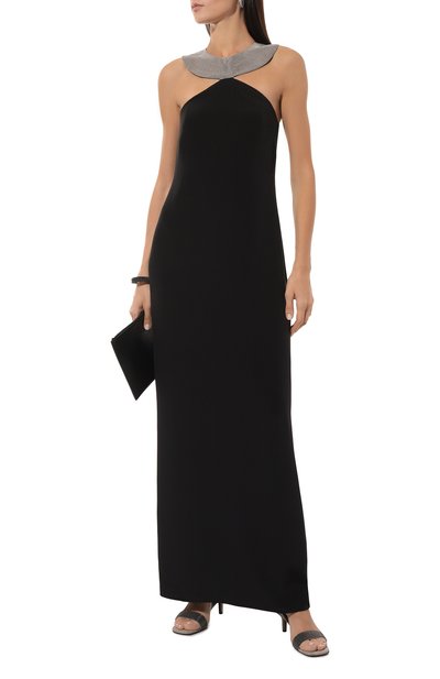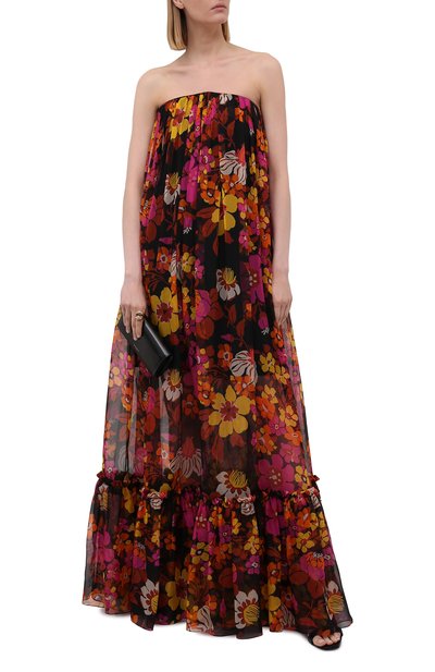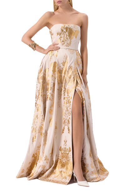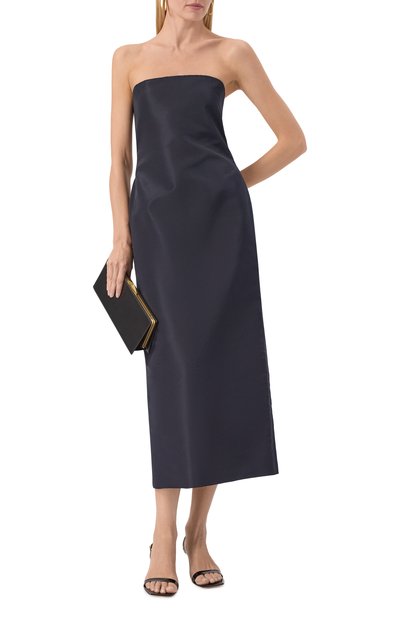 Платье-бюстье с мягкими складками на расклешенном подоле сшили вручную из шелка. Лиф с небольшим вырезом украсили драпировками. Модель застегивается потайной молнией сзади.