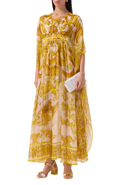 Свободное макси-платье с пуговицей на горловине сзади выполнили из полиэстера. Вырез спереди подчеркнули фигурной нашивкой со стразами и стеклярусом.
