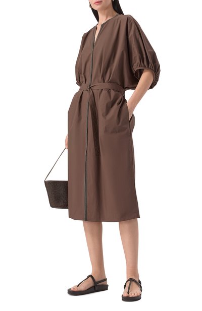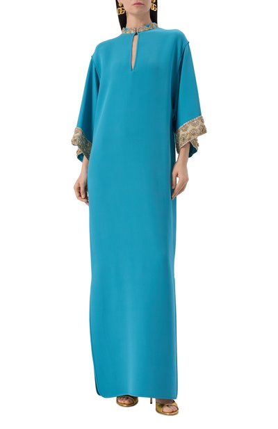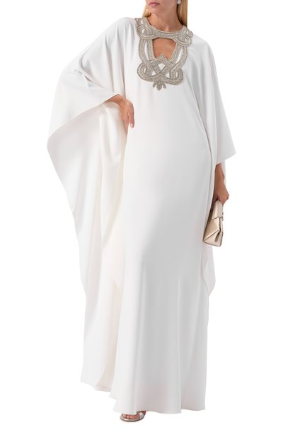 Свободное макси-платье с пуговицей на горловине сзади выполнили из полиэстера. Вырез спереди подчеркнули фигурной нашивкой со стразами и стеклярусом.