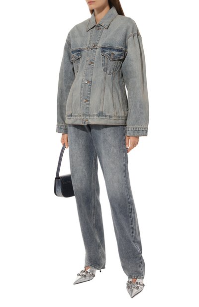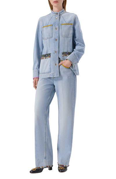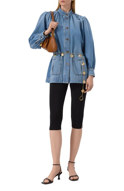 Короткую куртку со спущенной линией плеч выполнили из выбеленного денима на основе органического хлопка. Модель с брендированной нашивкой на одном из двух карманов застегивается молнией, скрытой под планкой с кнопками.