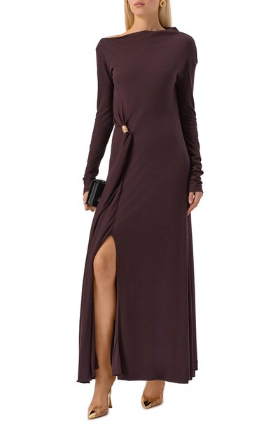 Платье с отложным воротником и манжетами-воланами выполнили из микса вискозы, полиэстера и полиамида в рубчик. Модель с расклешенным подолом и двумя нагрудными карманами застегивается акцентными пуговицами спереди.