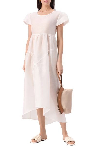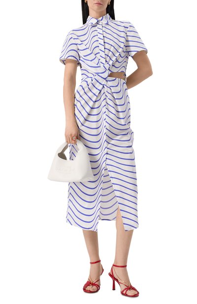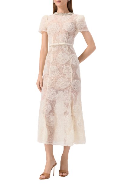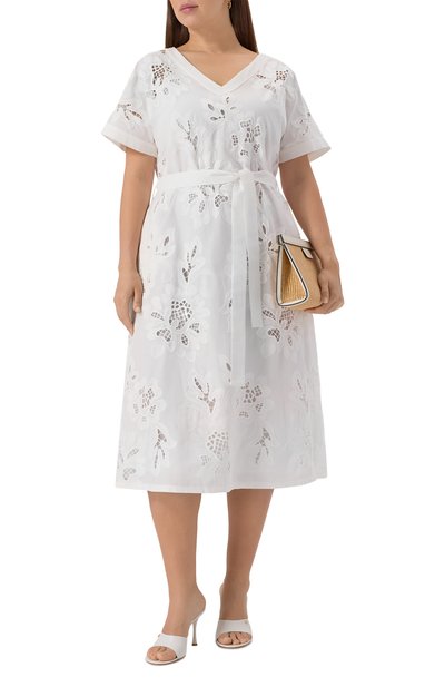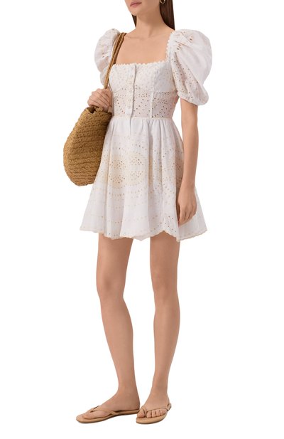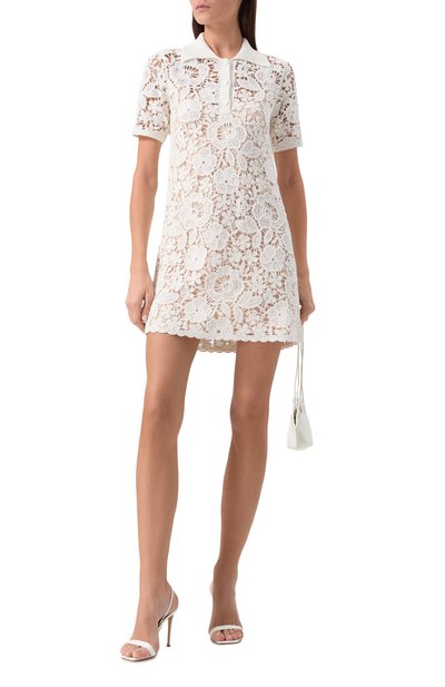 Мини-платье выполнили из фестончатого кружева на основе полиамида и хлопка. Приталенная модель с контрастным воротником и четырьмя накладными карманами застегивается акцентными пуговицами. В комплекте – нижнее платье-майка.