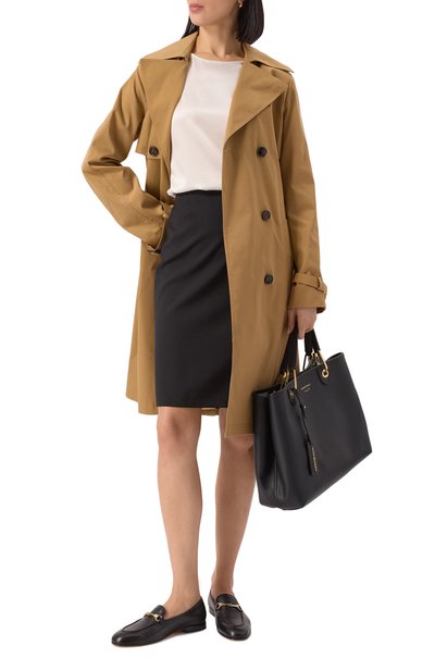 Блузку из цветочного кружева с фестончатым краем дополнили контрастным отложным воротником. С его оттенком зарифмовали кант по краям клапанов нагрудных карманов. Модель застегивается золотистыми пуговицами.
