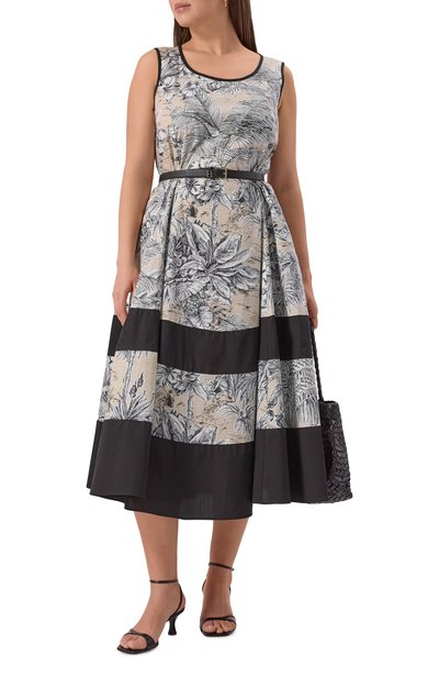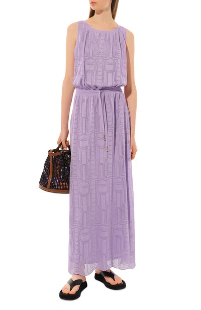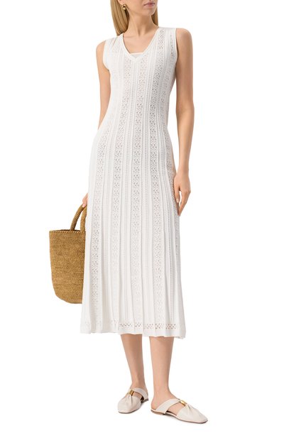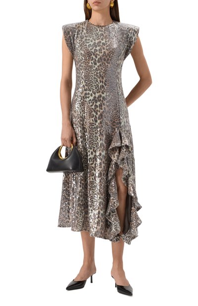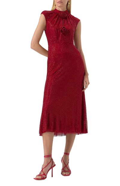 Миди-платье с круглой горловиной и глубокими окатами выполнили из стрейчевой полиэстеровой сетки, покрытой кристаллами. Приталенная модель застегивается потайной молнией на спинке.