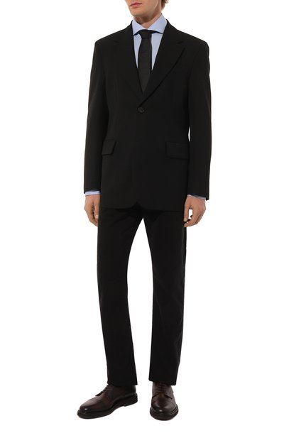 Дерби с миндалевидным мысом выполнили вручную из гладкой полированной кожи. Туфли с эластичной текстильной вставкой вместо язычка установили на резиновую подошву с широким каблуком.