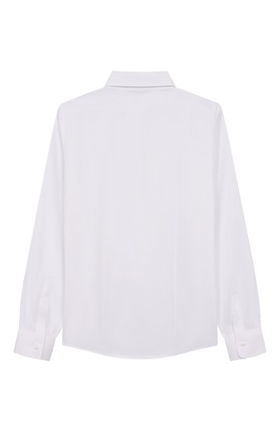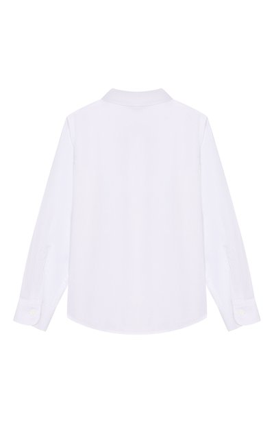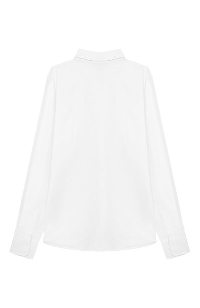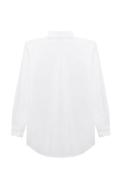Для пошива рубашки с закругленным низом использовали гладкий хлопок. Спереди модель украсили контрастным текстовым принтом с логотипом бренда.