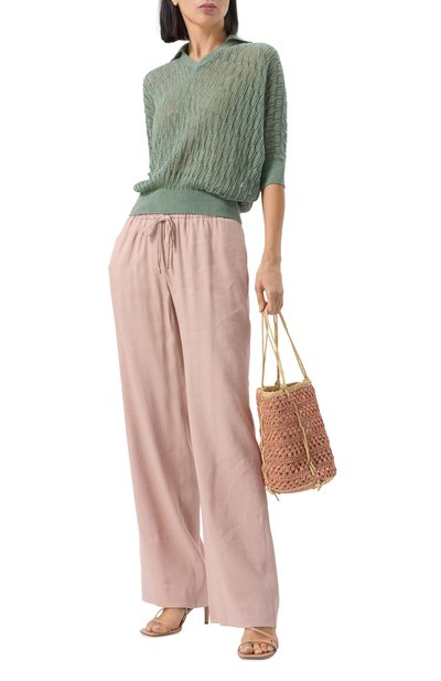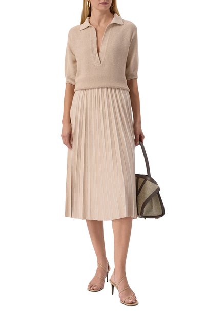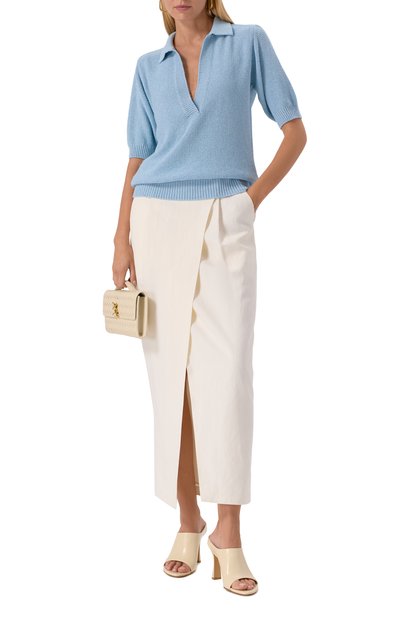 Поло со спущенной линией плеч сшили из трикотажа на основе шерсти и кашемира. Эластичная модель с манжетами и поясом в рубчик застегивается обтяжными пуговицами в тон.