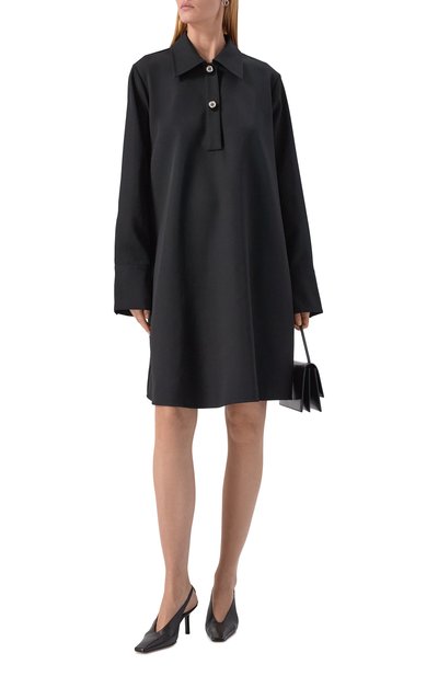 Платье со спущенной линией плеч выполнили из шерстяного трикотажа с добавлением кашемира. Круглую горловину, пояс и манжеты модели подчеркнули мелким рубчиком.
