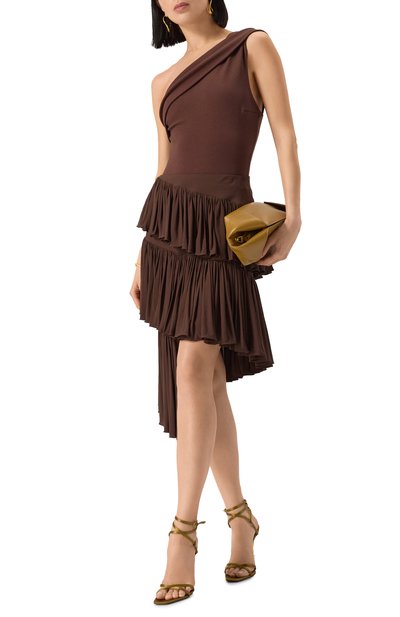 Юбку запашного кроя сшили из жатой матовой кожи. Модель с широким поясом и потайной застежкой может стать основой повседневного образа с поло и туфлями на шпильке.