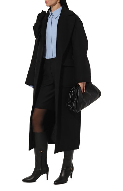 Сапоги с зауженным мысом, высокой тонкой шпилькой и свободным голенищем выполнили из гладкой телячьей кожи. Модель без застежки отделали внутри мягкой наппой.