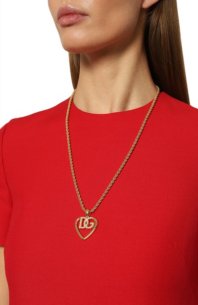 Подвеску в форме сердца с монограммой DG в центре инкрустировали прозрачными кристаллами. Украшение на цепочке плетения ролло изготовили из латуни.