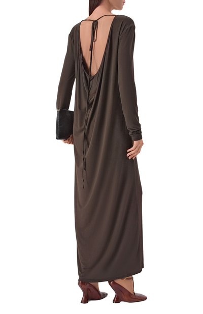 Платье со слегка расклешенными рукавами выполнили из шерстяного трикотажа, в состав которого добавили кашемир. Спереди и сзади изделие дополнили рельефными вертикальными швами.