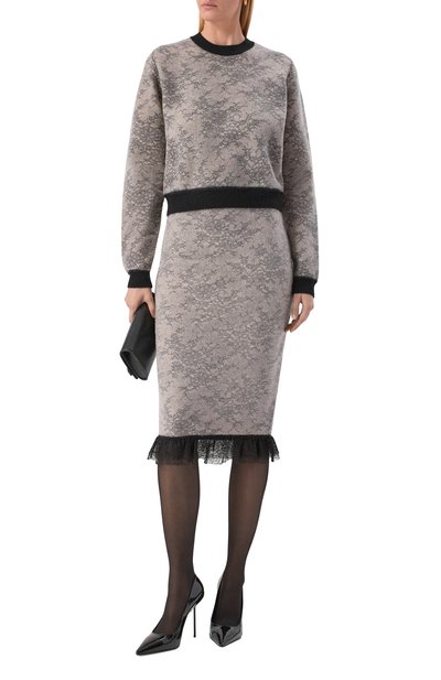 Для создания рубашки с фигурным низом и прямоугольными манжетами использовали трикотаж из микса шерсти и кашемира. Модель, прошитая контрастной нитью, застегивается кнопками.