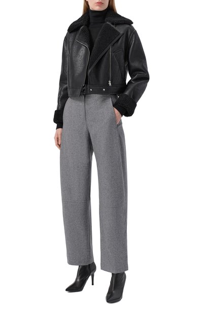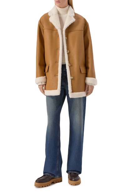 Для пошива дубленки прямого кроя использовали искусственную кожу, а воротник, манжеты и пояс отделали материалом под овчину. Сзади модель с двумя карманами украсили логотипом марки.